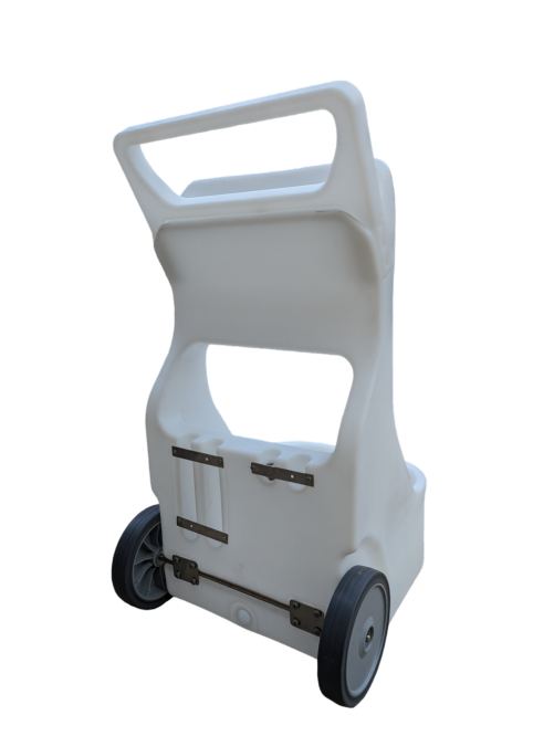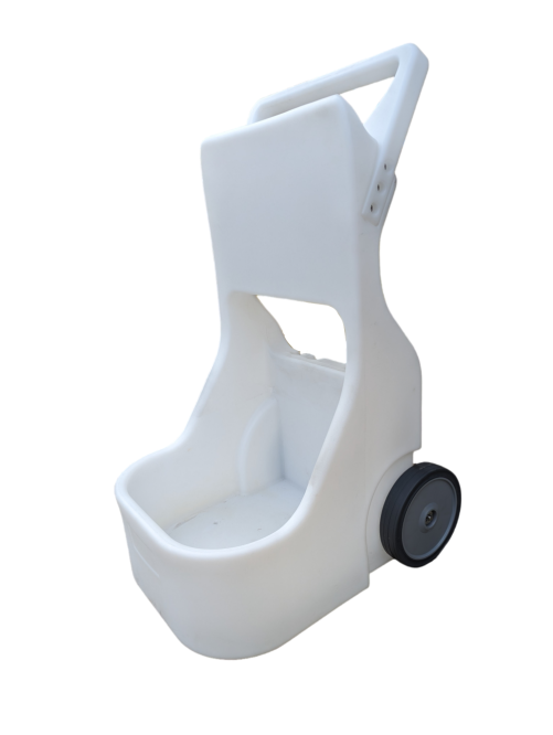 Wytrzymały wózek z tworzywa sztucznego, przemyślanie zaprojektowany z wbudowaną kuwetą ociekową, aby zapobiegać rozlewaniu substancji podczas transportu.