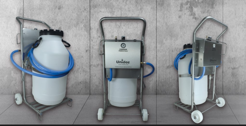 Kwasoodporna pianownica z 50l zbiornikiem bezciśnieniowym zamontowanym na wózku ze stali nierdzewnej, system pianujący wykorzystuje pompę pneumatyczną, która pobiera przygotowany roztwór roboczy z 50 litrowego zbiornika i wyrzuca w postaci gęstej piany na odległość do 6m.